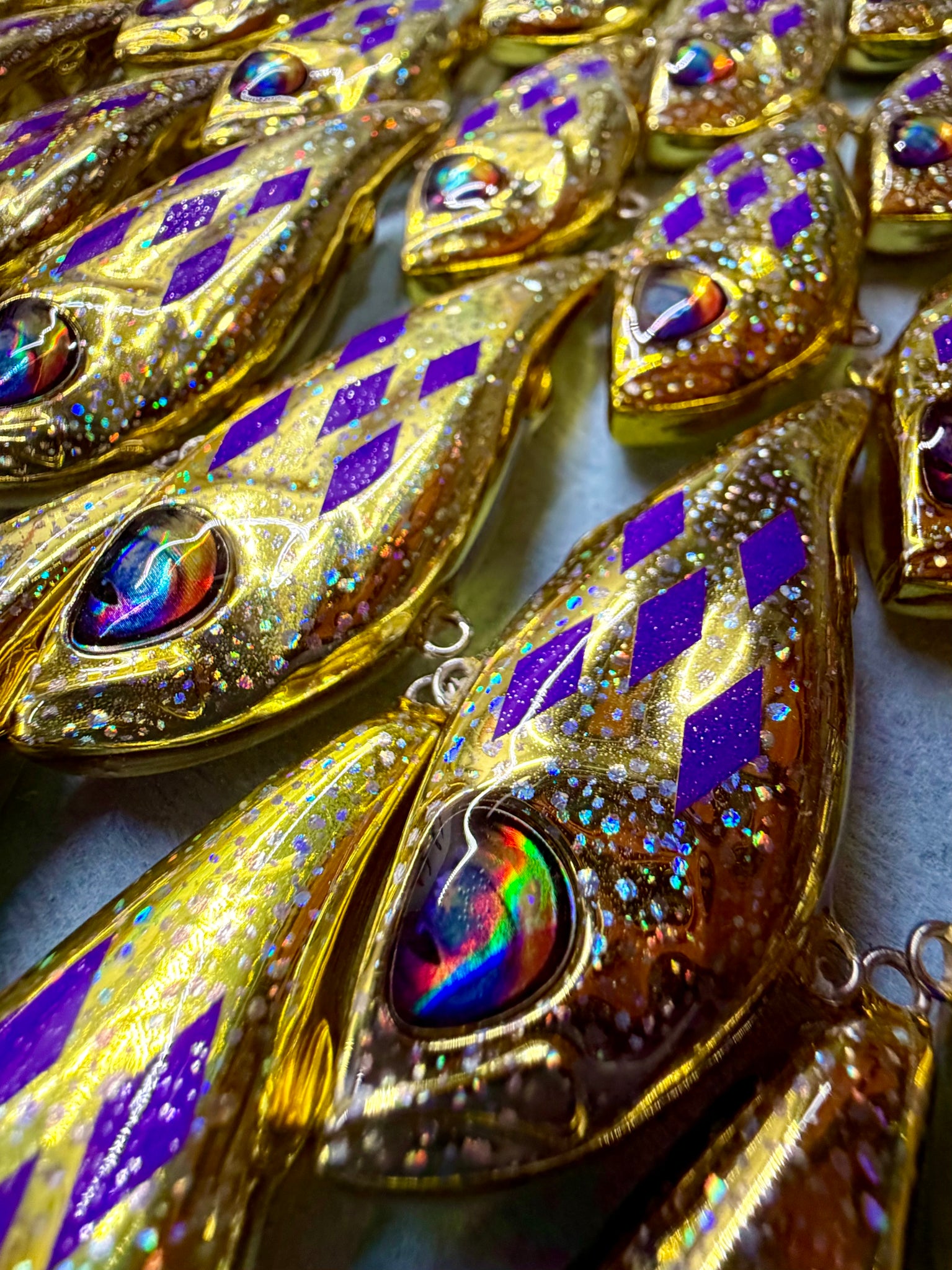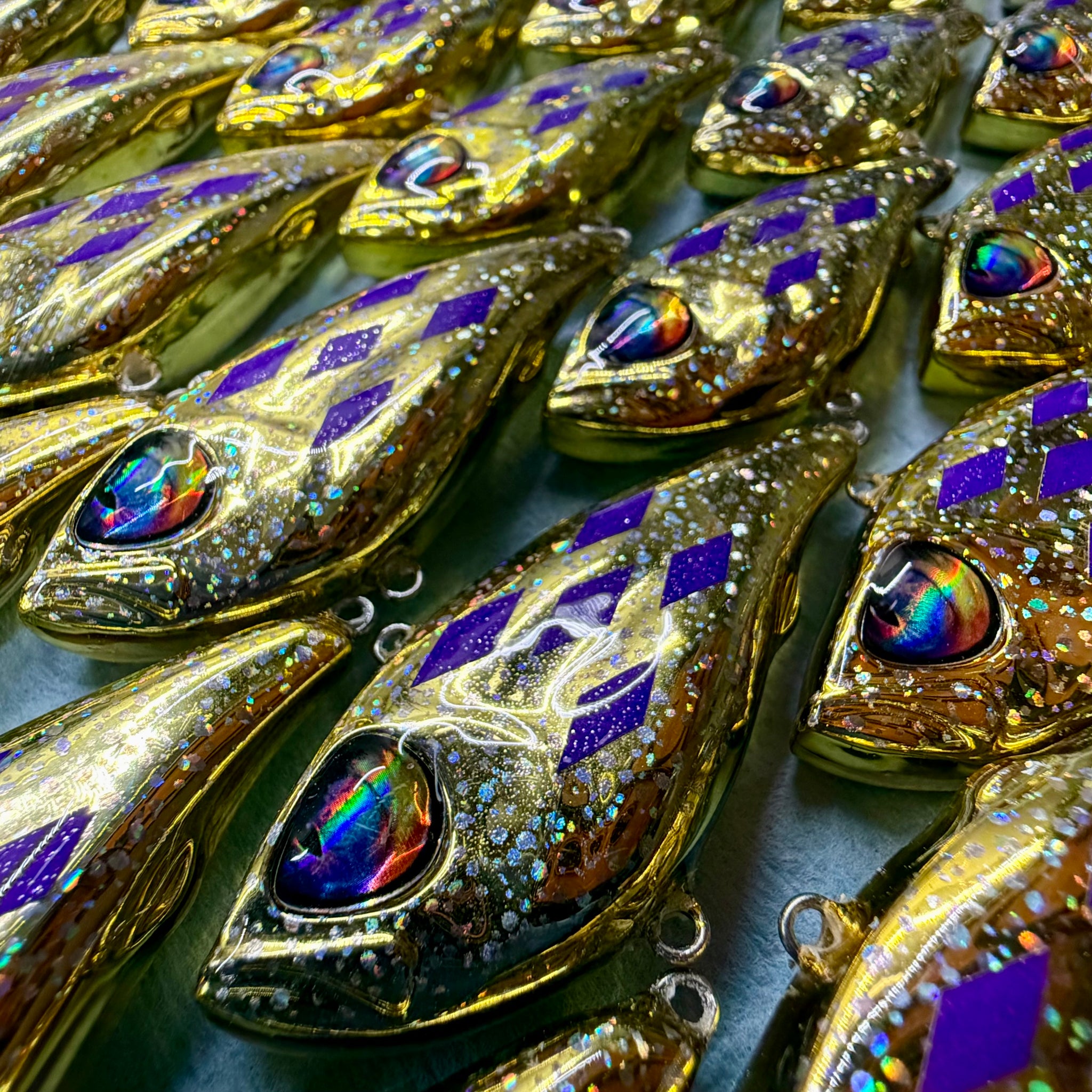 Golden chrome Mugshot 60’s, laden in holographic speckle and purple diamonds.